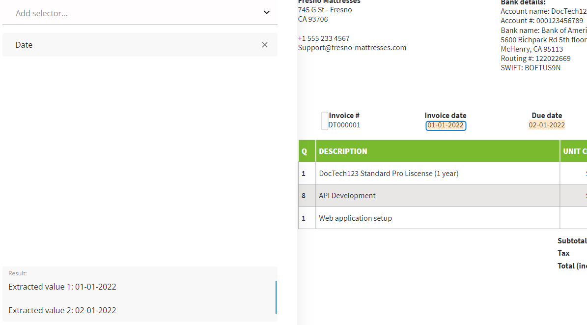As you can see in the screenshot above, using the Date selector as a standalone selector will select all detected date values from the document (2 values for this sample).