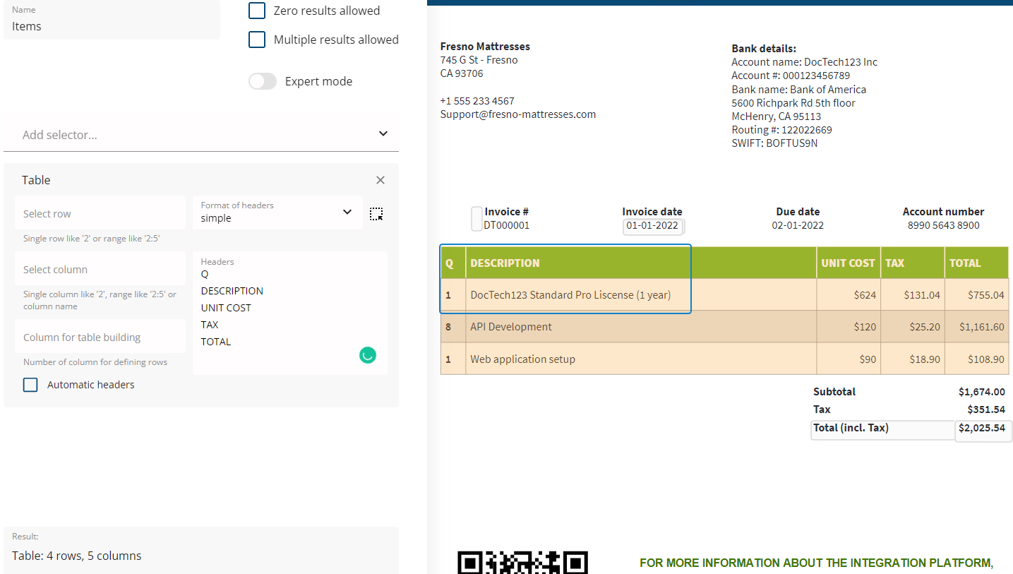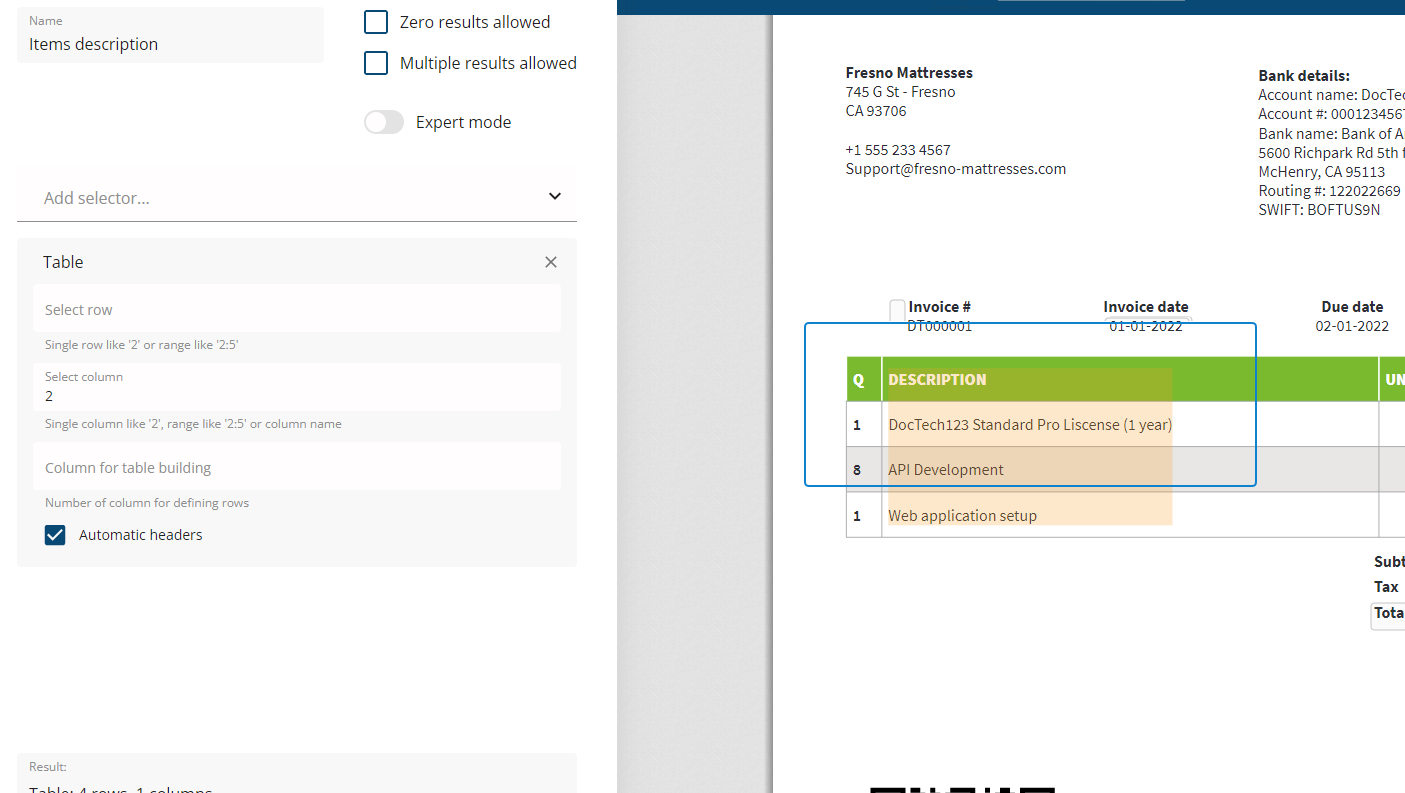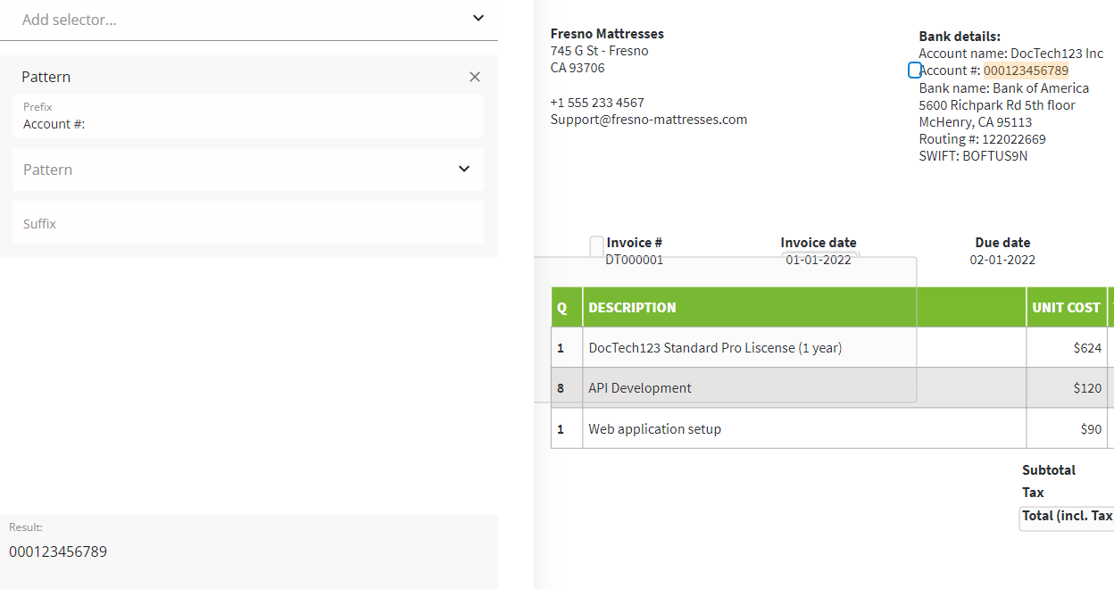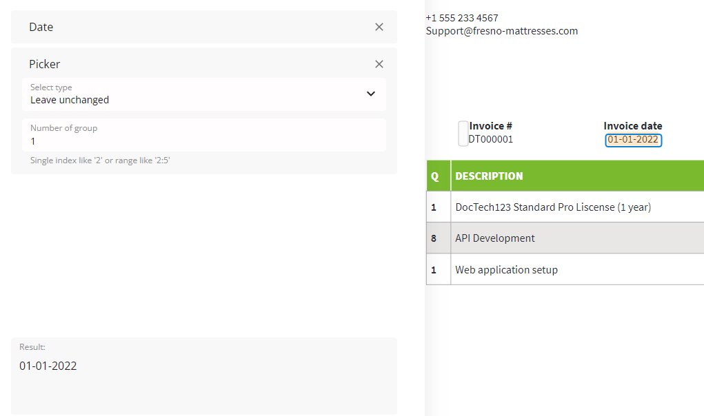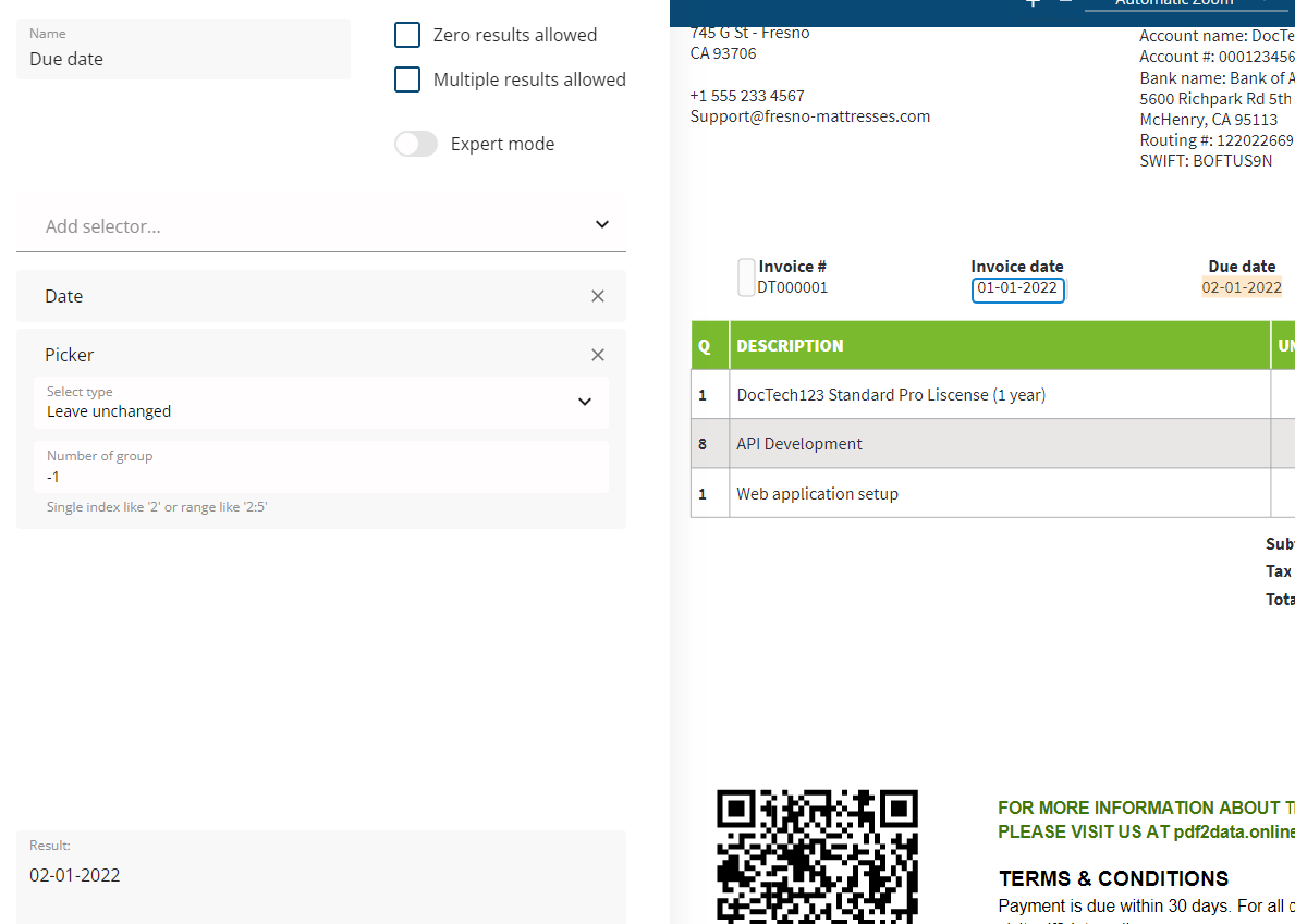 As you remember, we picked the first value for the Invoice date. For "Due to" we need the second one, or the last one as this can be more convenient. If you need to select a value using Picker from the end of the output, you can use negative numbers, e.g -1 for the last item.