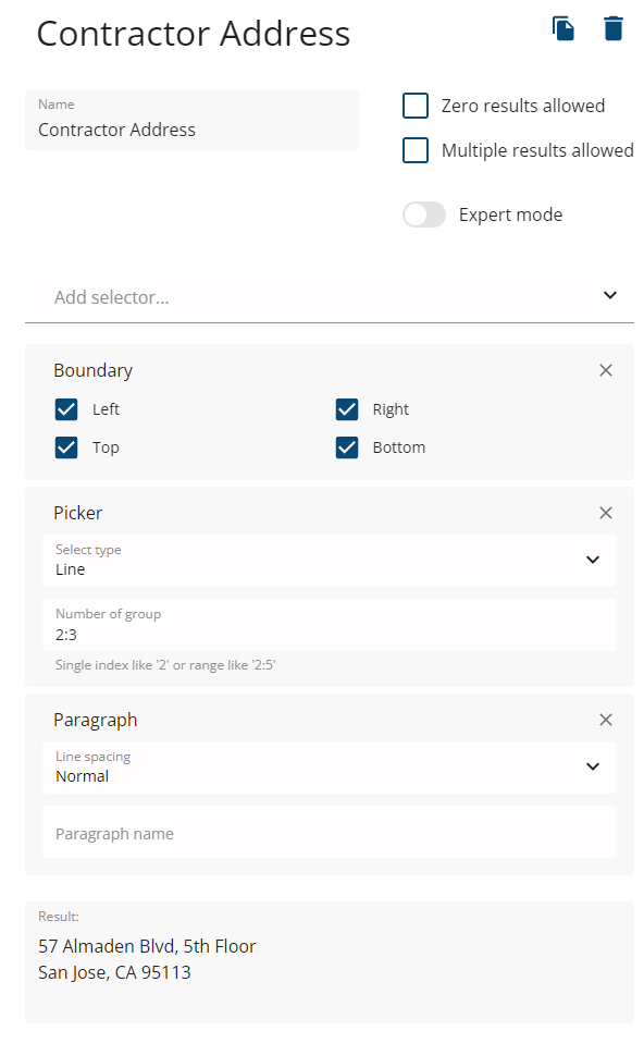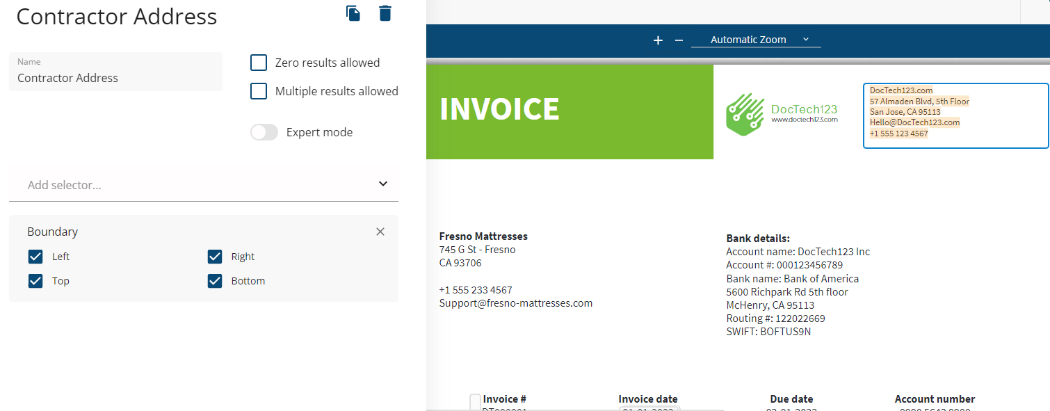 In our example, the contractor's information is rigidly located in the upper right corner of the invoice. When data to be extracted is fixed relative to the page boundaries, the fastest reliable way to extract them is using the boundary selector.