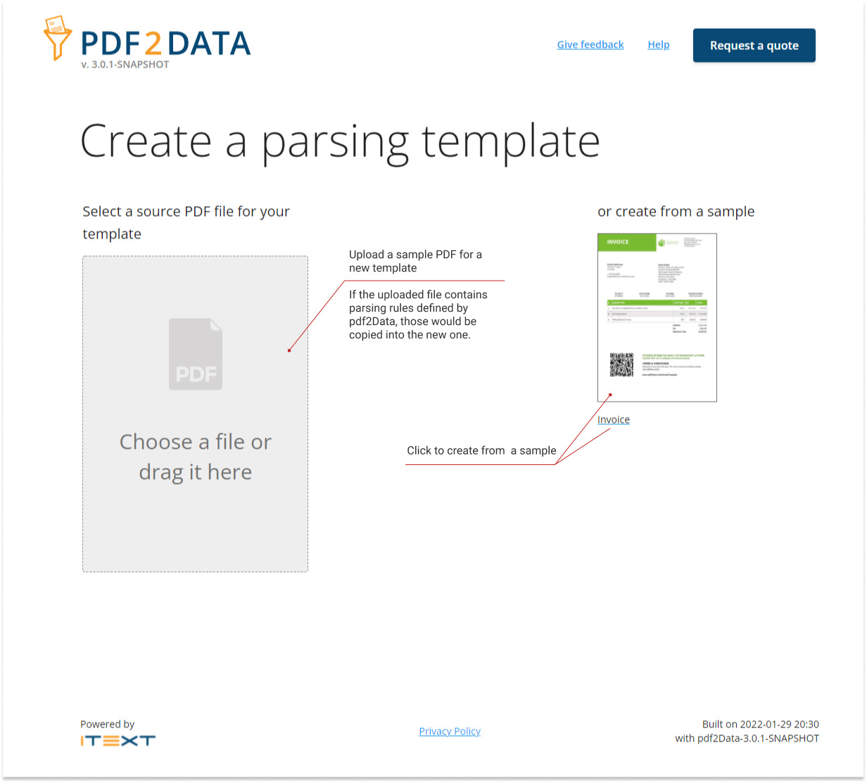 Since an extraction template is effectively a sample PDF with parsing rules added on top of it, you should start with uploading a PDF through the web form.
