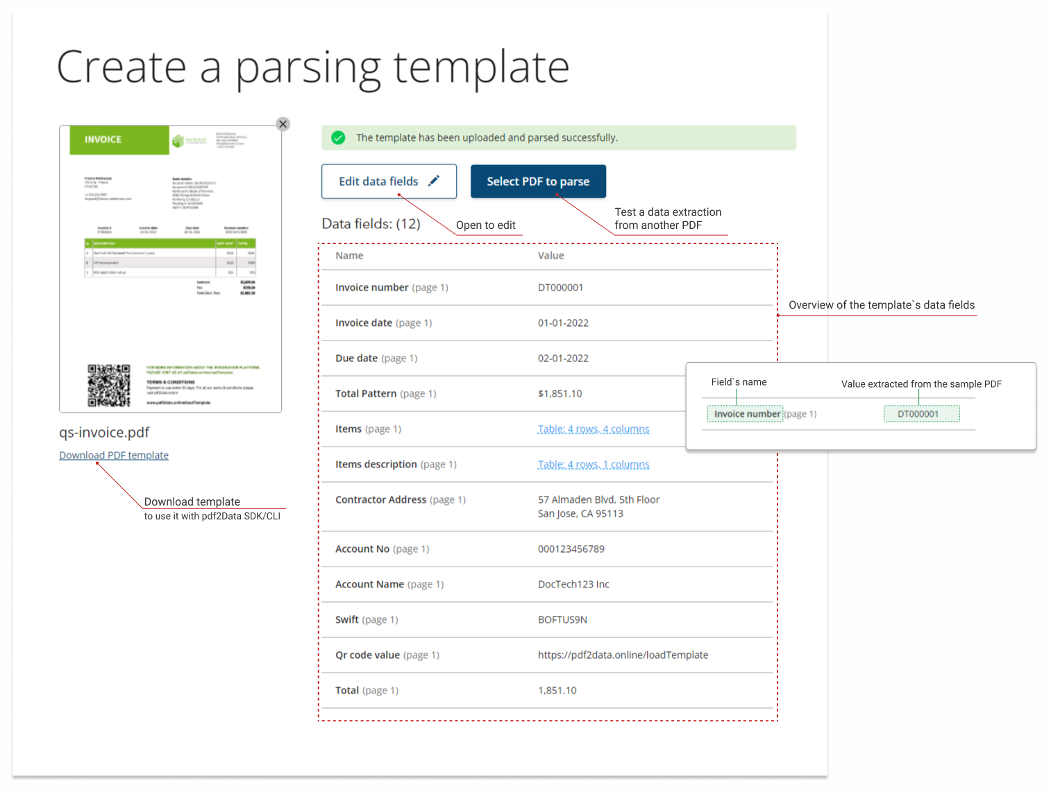 When the template is uploaded, iText pdf2Data parses it and generates the Template overview.