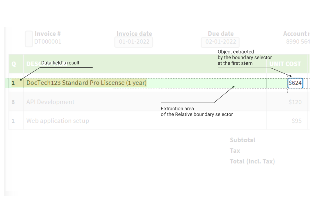 It restricts the area on the page where the data to be extracted is located. Unlike the Boundary selector - pdf2Data Documentation, the restriction will be applied depending on the objects returned by the preceding selector.