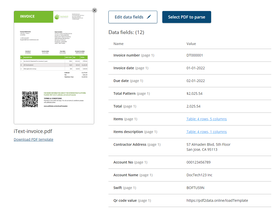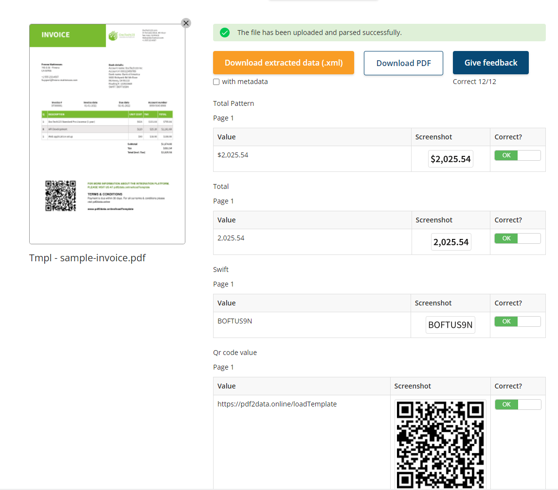 iText pdf2Data applies the selected template to the file and reports which data will be extracted. In this report, you also find screenshots of how extracted values look in the PDF that has been parsed, so you can compare and provide us with feedback if you'd like.