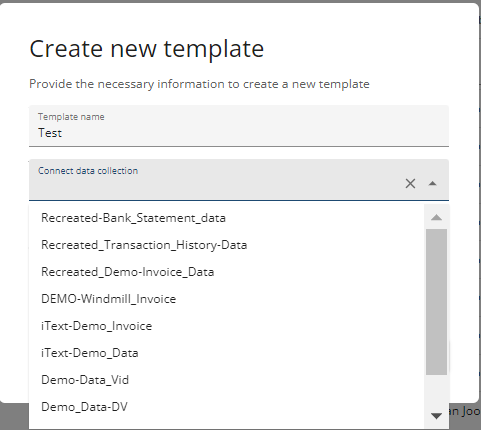 When combining a template with data, it will provide you a list to choose from the data collections that have been added to your workspace thus far.
