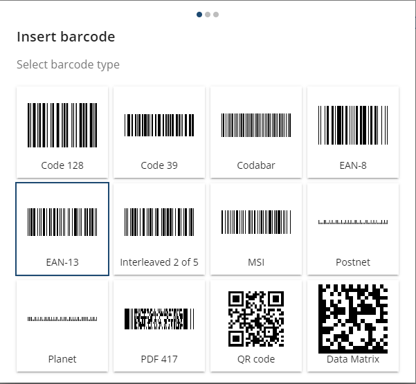 The first step in this wizard is the selection of a barcode type.
