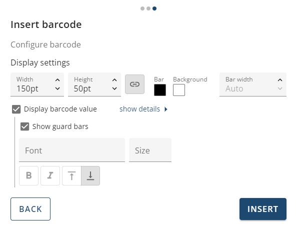 - edit the display settings of the actual barcode (bar color and size, value display etc)