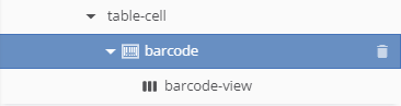 When the barcode is inserted, the Template Elements tree will show two entries for a barcode. A barcode element and a child element called barcode-view. Optionally, if you insert a label for the barcode a rich text element can also be a child element of the barcode element.