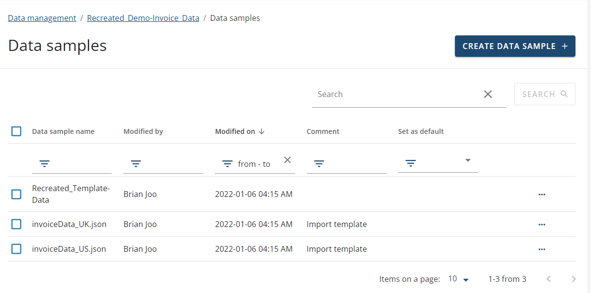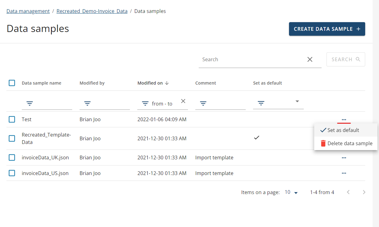 A new data sample will be created in your data collection which you can then 'set as default', which can be done by clicking on the ellipsis over on the right-hand side and selecting 'Set as Default'.