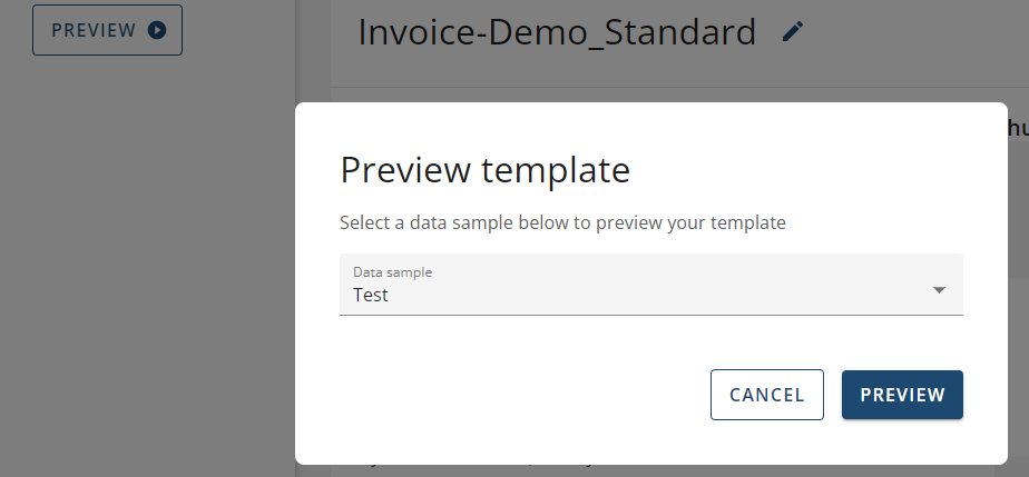 Below, you can see that one of the templates tied to the data collection is now displaying the new data sample (named 'Test'). Also, when you preview the template, it automatically has the new data sample that was set as default as the chosen data sample being used to preview and generate your template.