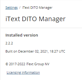 The current version of the iText DITO Manager being used can be seen on this page; you can also see more details about the licensing information.