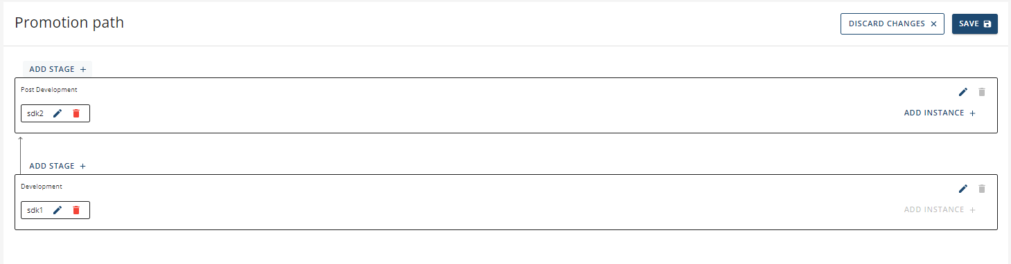 This page is where you can build out your own unique workspace's promotion path by adding multiple stages. Each stage is connected to an instance and one stage can contain multiple instances.