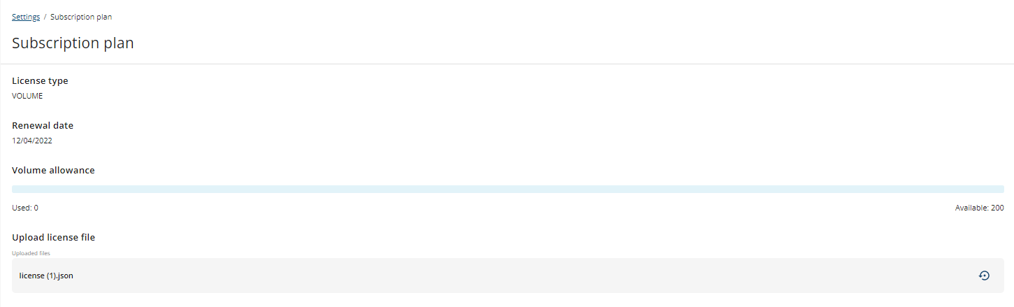 This tab displays your current subscription (license), detailing the type of license, renewal date, and the volume count of your plan.