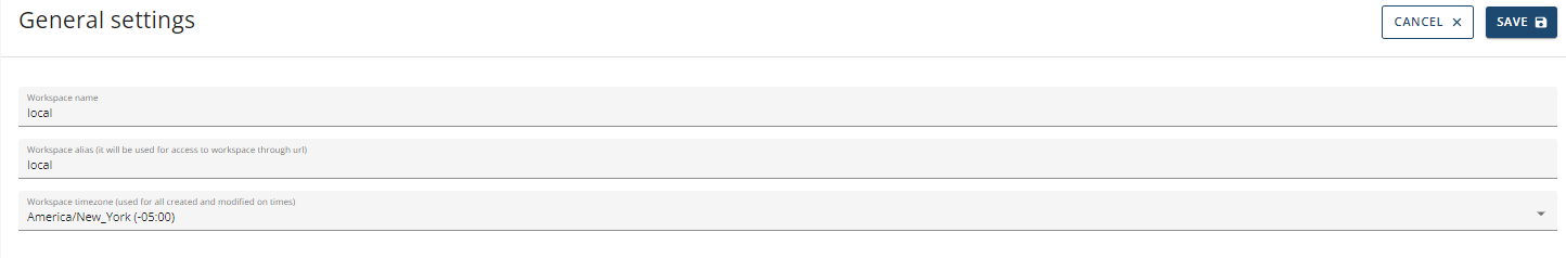 This is where users will be able to set/change their workspace's name and alias which is used to access their workspace through a URL. In addition, they can set the time zone for their account which will be used as the reference point for when an item is created or modified.