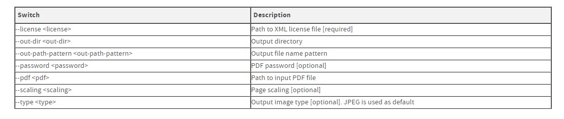 Note that --license is required, and is used to specify the location of your pdfRender license file.