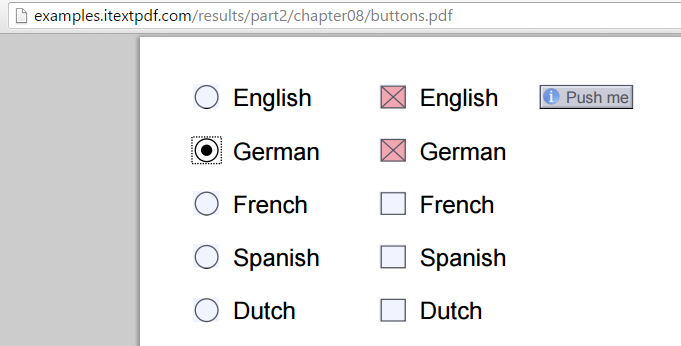 That question reveals a lack of understanding of PDF. When we looked for the possible values of a check box (or radio button) in the previous answer, we asked for the different appearance states. These appearance states are small pieces of content that are expressed in PDF syntax.