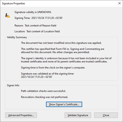 The value of the signature appearance Location property is used in the visual appearance Description and is stored in the Location entry of the signature field value. This entry is specified as The CPU host name or physical location of the signing.