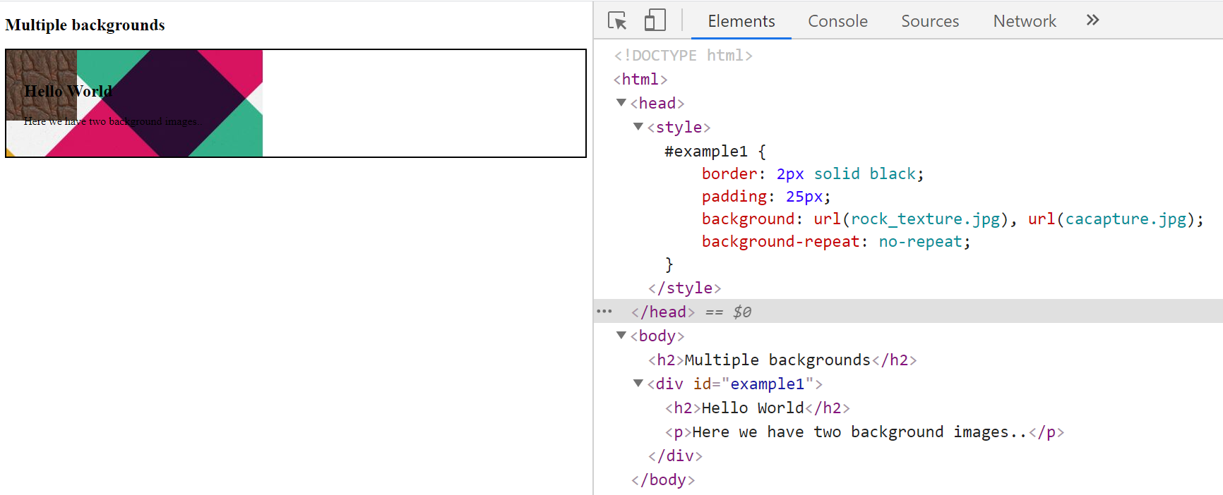 As a highlighted example, below is a screenshot of some simple HTML where a div element has a CSS declared multi-image background:
