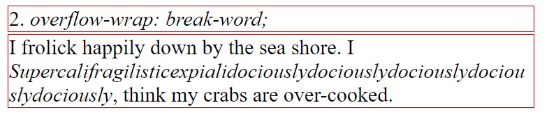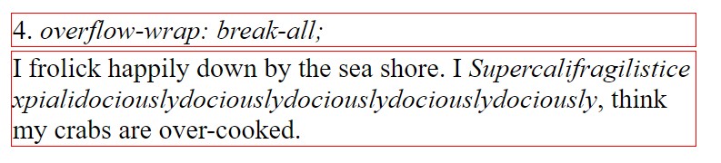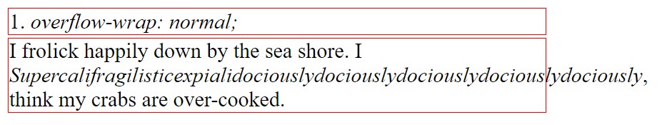 The overflow-wrap: normal; setting asserts that line breaks shall only occur at natural moments (i.e. where there is space between two words). As such, long words like those below will overflow outside of their bounds.