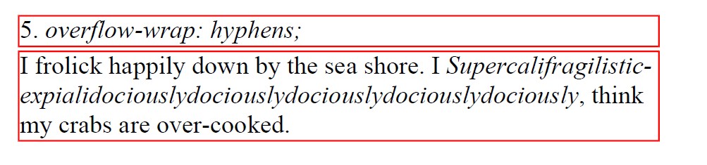 Finally, overflow-wrap: hyphens; includes the functionality of break-all, but inserts hyphens wherever there are line-breaks (like a novel).